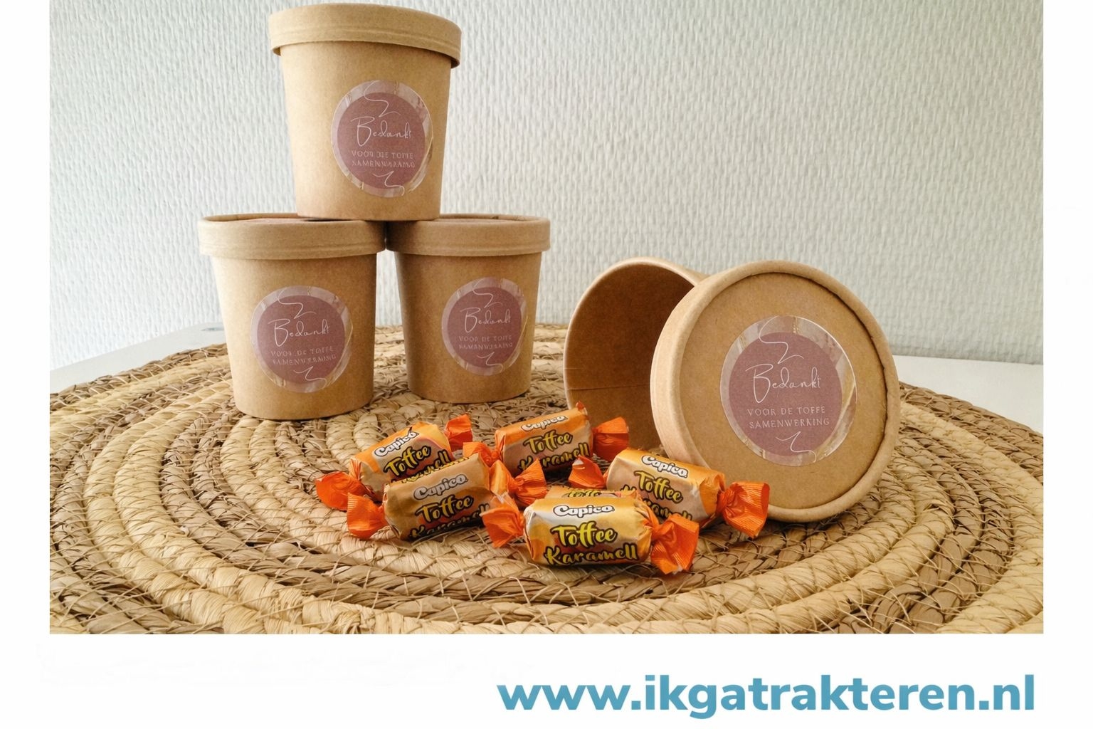 | Verpakking | Kraft baker met stickers: "Bedankt voor de toffe samenwerking" |